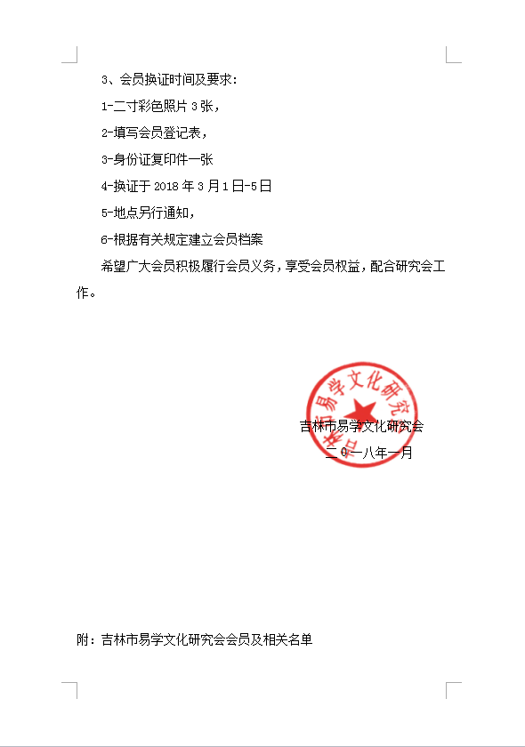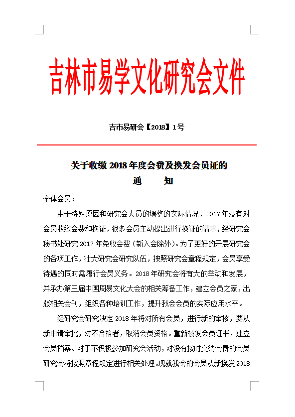 由于特殊原因和研究会人员的调整的实际情况,2017年没有对会员收缴会费和换证,很多会员主动提出进行换证的请求,经研究会秘书处研究2017年免收会费(新入会除外)。为了更好的开展研究会的各项工作,壮大研究会研究队伍,按照研究会章程规定,会员享受待遇的同时需履行会员义务。2018年研究会将有大的举动和发展,并承办第三届中国周易文化大会的相关筹备工作,建立会员之家,出版相关会刊,组织各种培训工作,提升我会会员的实际应用水平。