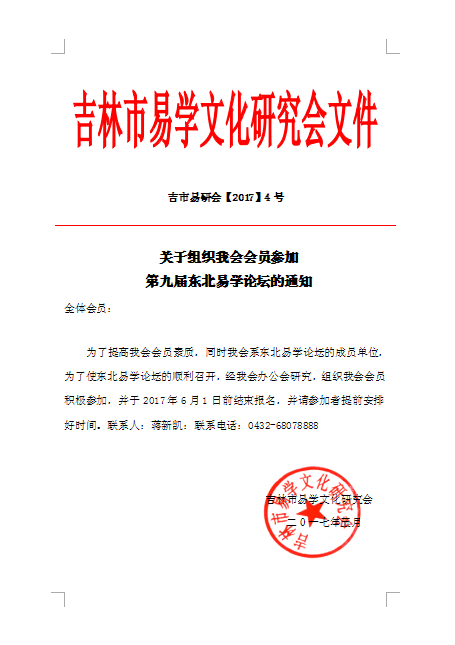 我会系东北易学论坛的成员单位,为了使东北易学论坛的顺利召开,经我会办公会研究,组织我会会员积极参加,并于2017年6月1日前结束报名,并请参加者提前安排好时间。联系人:蒋新凯:联系电话:0432-68078888