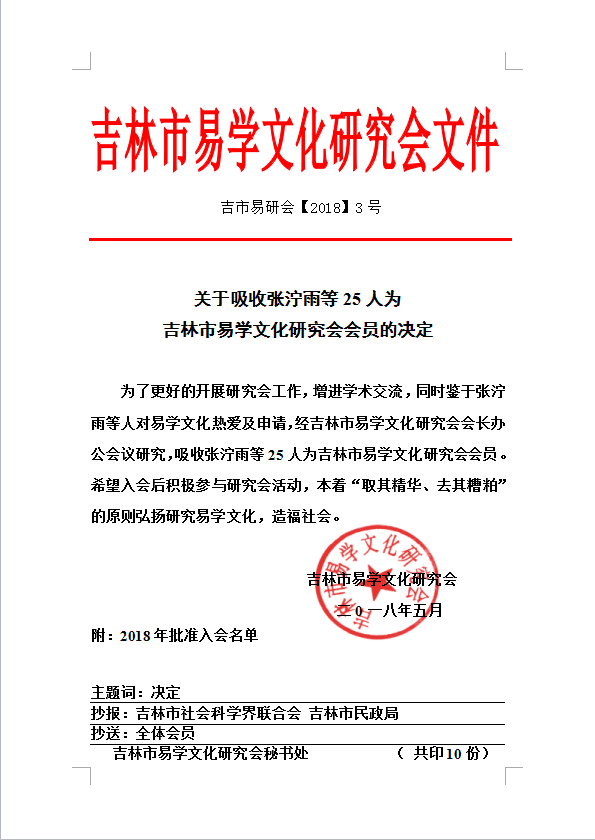 为了更好的开展研究会工作,增进学术交流,同时鉴于张泞雨等人对易学文化热爱及申请,经吉林市易学文化研究会会长办公会议研究,吸收张泞雨等25为吉林市易学文化研究会会员。希望入会后积极参与研究会活动,本着“取其精华、去其糟粕”的原则弘扬研究易学文化,造福社会
